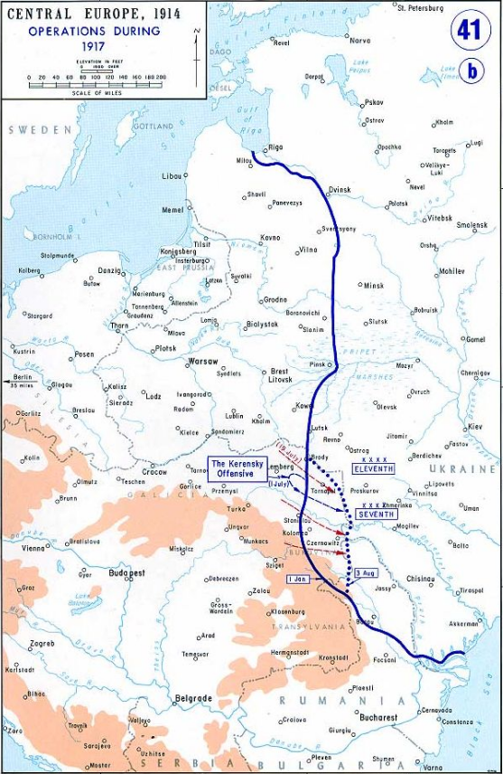 The Kerensky Offensive (Russian: Наступление Керенского), also commonly known as the July Offensive (Russian: Июльское наступление) or Galician Offensive, was the last Russian offensive in World War I. It was decided by Alexander Kerensky, Minister of War in the Russian provisional government, and led by General Brusilov. Such a decision was ill-timed, because, following the February Revolution, there were strong popular demands for peace, especially within the Russian Army, whose fighting capabilities were quickly deteriorating. . . . Starting on July 1, 1917 the Russian troops attacked the Austro-Germans in Galicia, pushing toward Lvov. The operations involved the Russian 11th, 7th and 8th Armies and the Austro-German South Army (General von Bothmer) and the Austrian 7th and 3rd Armies. After an initial success, the offensive was halted because the Russian soldiers soon mutinied and refused to fight. It collapsed altogether by July 16.