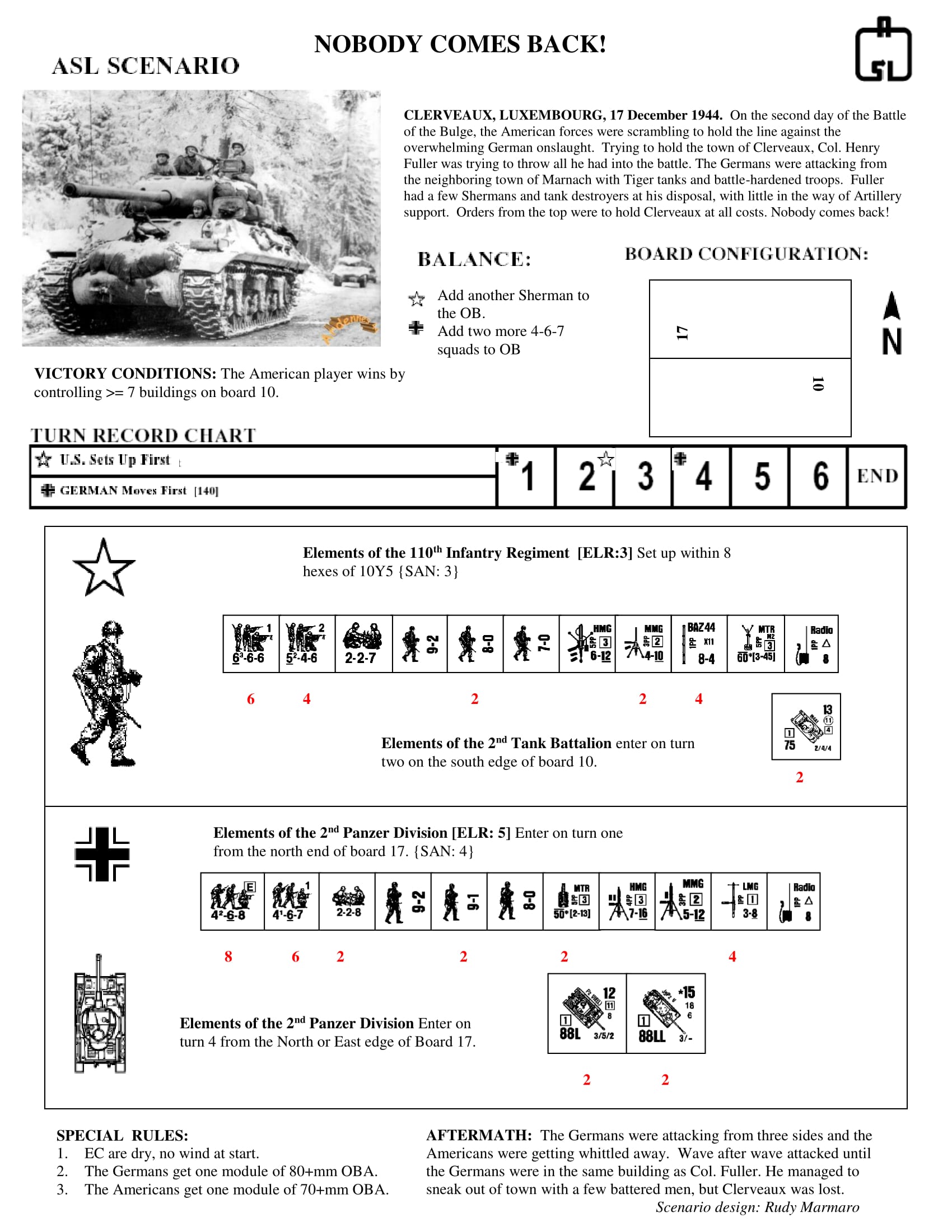 On the second day of the Battle of the Bulge, the American forces were scrambling to hold the line against the overwhelming German onslaught. Trying to hold the town of Clervaux, Col. Hurley Fuller was trying to throw all he had into battle. The Germans were attacking from the neighboring town of Marnach with Tiger tanks and battle-hardened troops. Fuller had a few Shermans and tank destroyers at his disposal, with little in the way of artillery support. Orders from the top were to hold Clervaux at all costs. Nobody comes back!Attacker: German (2nd Panzer-Division)