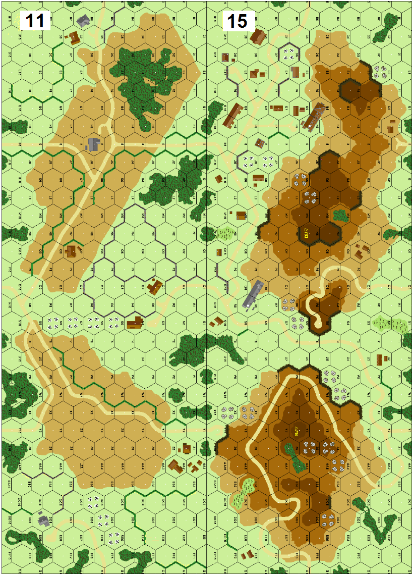 SPECIAL RULES: 1) All buildings on map 15 are wooden and worth 1 point per hex except those placed in hexes Q8 and R8 which are stone and worth 3 points per hex, at the beginning of the scenario all buildings are under Greek control. . .2) The assignment of the side with which you play is done through an auction. Before the draw, both players secretly write a number from 0 to 24, these numbers must be declared concurrently and the player who wrote the highest number plays with the Italians. . . .3) In the initial setup, both players can split their OB counters into up to 3 teams. . . . VICTORY CONDITIONS: The Italian player wins if he reaches or exceeds, with the victory points, the number declared in the auction. One (1) victory point is obtained with the possession of the building hexes of map 15 (Exc: Q8-R8 hexes worth 3 points). If the Italian does not score the points declared, the Greek player wins.
