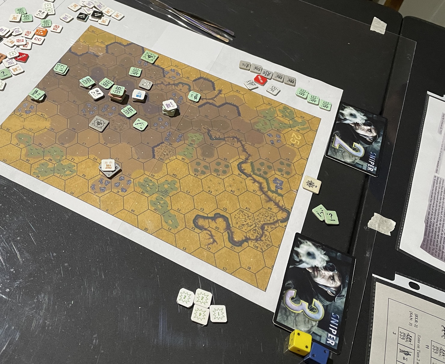 I had the tribesmen in this one, and decided to infiltrate up the northern wadi to retain cover. While it's a sensible idea from a "life has value" perspective, it's probably too slow to win this scenario. On top of that, Joe rolled snake eyes in an early attack on my one and only qualified Ethiopian crew, resulting in a 1KIA and the end of any kind of effective fire with the 75. I agree with another commenter that a blanket fanaticism of both Italians and Eritreans seems a bit far-fetched here.