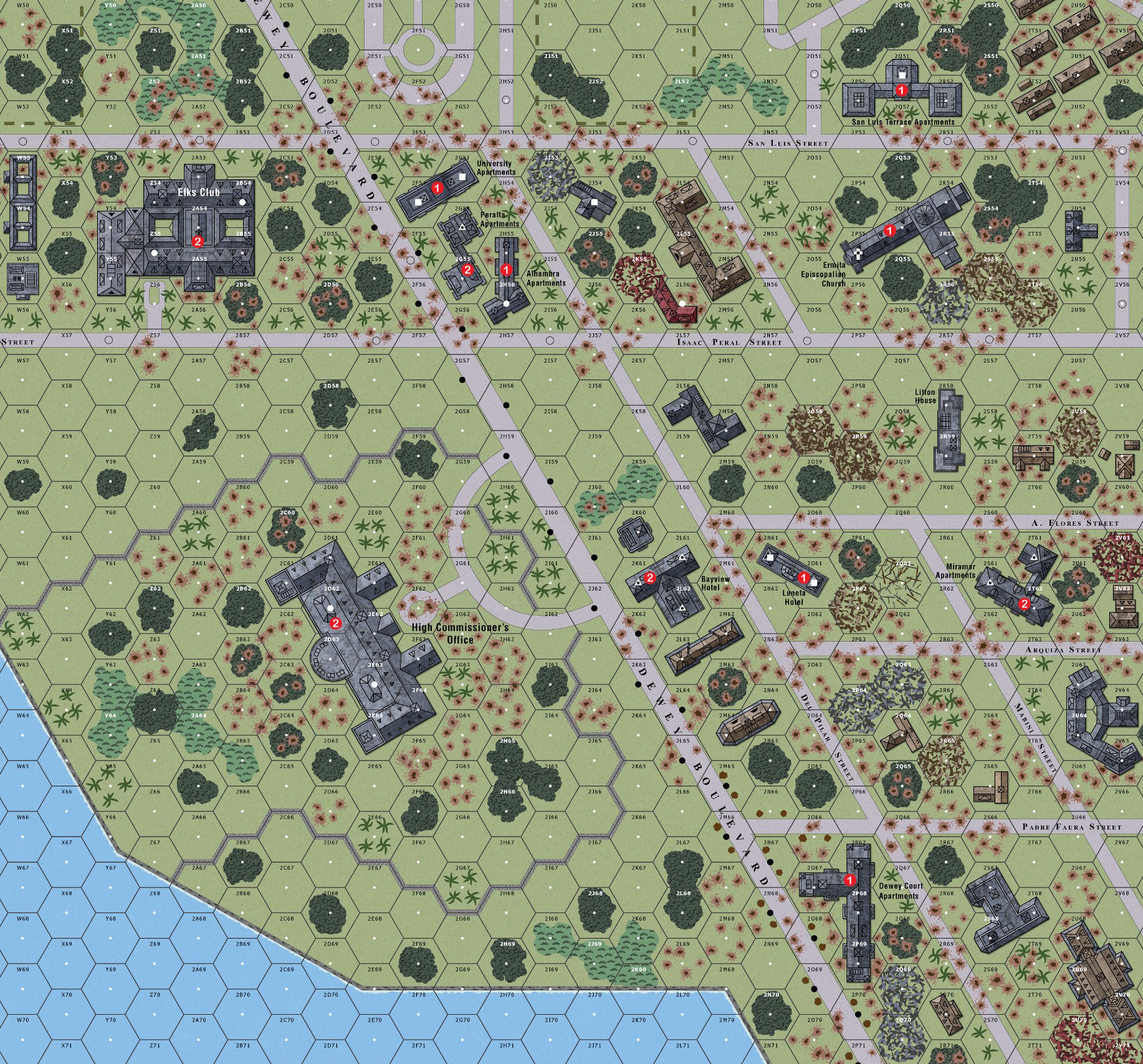 In downtown Manila just east of the High Commissioner's Office were several high-rise hotels and apartment buildings. These were the University Apartments, Peralta Apartments, Alhambra Apartments, Bayview Hotel, Miramar Apartments, Luneta Hotel and the San Luis Terrace Apartments. Each offered tremendous fields of fire and observation over the two large city parks, Intramuros, the Government buildings, the Manila Hotel, and the South Port facilities. Each building would need to be cleared floor by floor, room by room. From previous experience, the cavalrymen expected this to be another tough assignment.Attacker: American (1st Squadron, 12th Cavalry Regiment, 1st Cavalry Division)