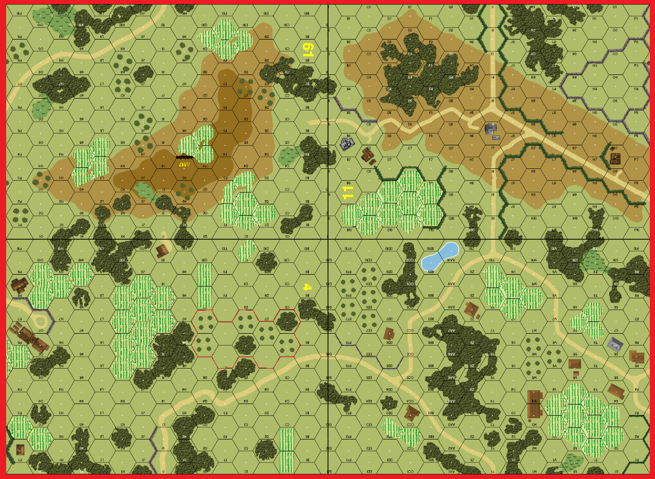 Canadians came up the middle avoiding the wire on the board edge and the Germans were ready for them. AT guns took out four tanks and the MMG had some impressive ROF which kept the Canadians broken. When the fifth tank immobilized in some mines Dan conceded not having enough points to exit. The Creeping Barrage was interesting but had little effect.