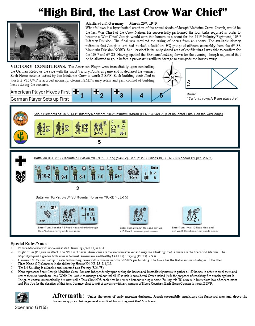 What follows is a hypothetical creation of the actual deeds of Joseph Medicine Crow. Joseph, would be the last War Chief of the Crow Nation. He successfully performed the four tasks required in order to become a War Chief. Joseph would earn this honors as a scout for the 411th Infantry Regiment, 103rd Infantry Division. The final task required the taking of horses from an enemy. The available history indicates that Joseph’s unit had tracked a battalion HQ group of officers ostensibly from the 6th SS Mountain Division NORD. Schillersdorf is the only shared area of conflict that I was able to confirm for the 103rd and 6th SS. Having spotted the Germans bedding down for the evening. Joseph requested that he be allowed to go in before a pre-assault artillery barrage to stampede the horses away.Attacker: American (Co. K, 114th Inf. Regt., 103 Inf. Div.)