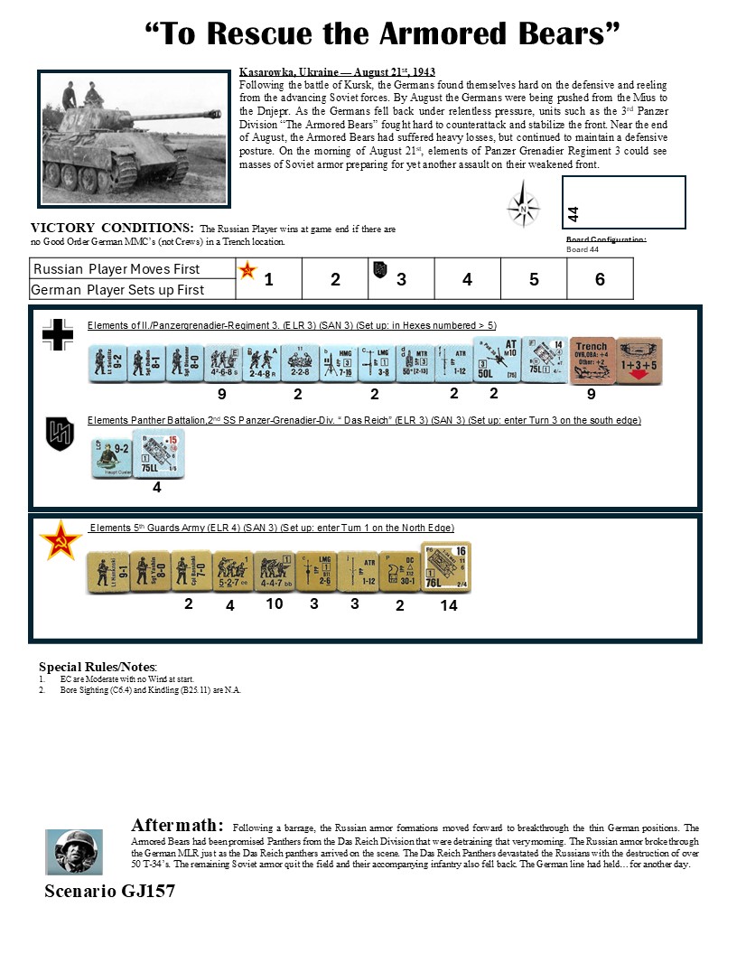 Following the battle of Kursk, the Germans found themselves hard on the defensive and reeling from the advancing Soviet forces. By August the Germans were being pushed from the Mius to the Dnieper. As the Germans fell back under relentless pressure, units such as the 3rd Panzer Division “The Armored Bears” fought hard to counterattack and stabilize the front. Near the end of August, the Armored Bears had suffered heavy losses but continued to maintain a defensive posture. On the morning of August 21st, elements of Panzer Grenadier Regiment 3 could see masses of Soviet armor preparing for yet another assault on their weakened front.Attacker: Russian (5th Guards Army)